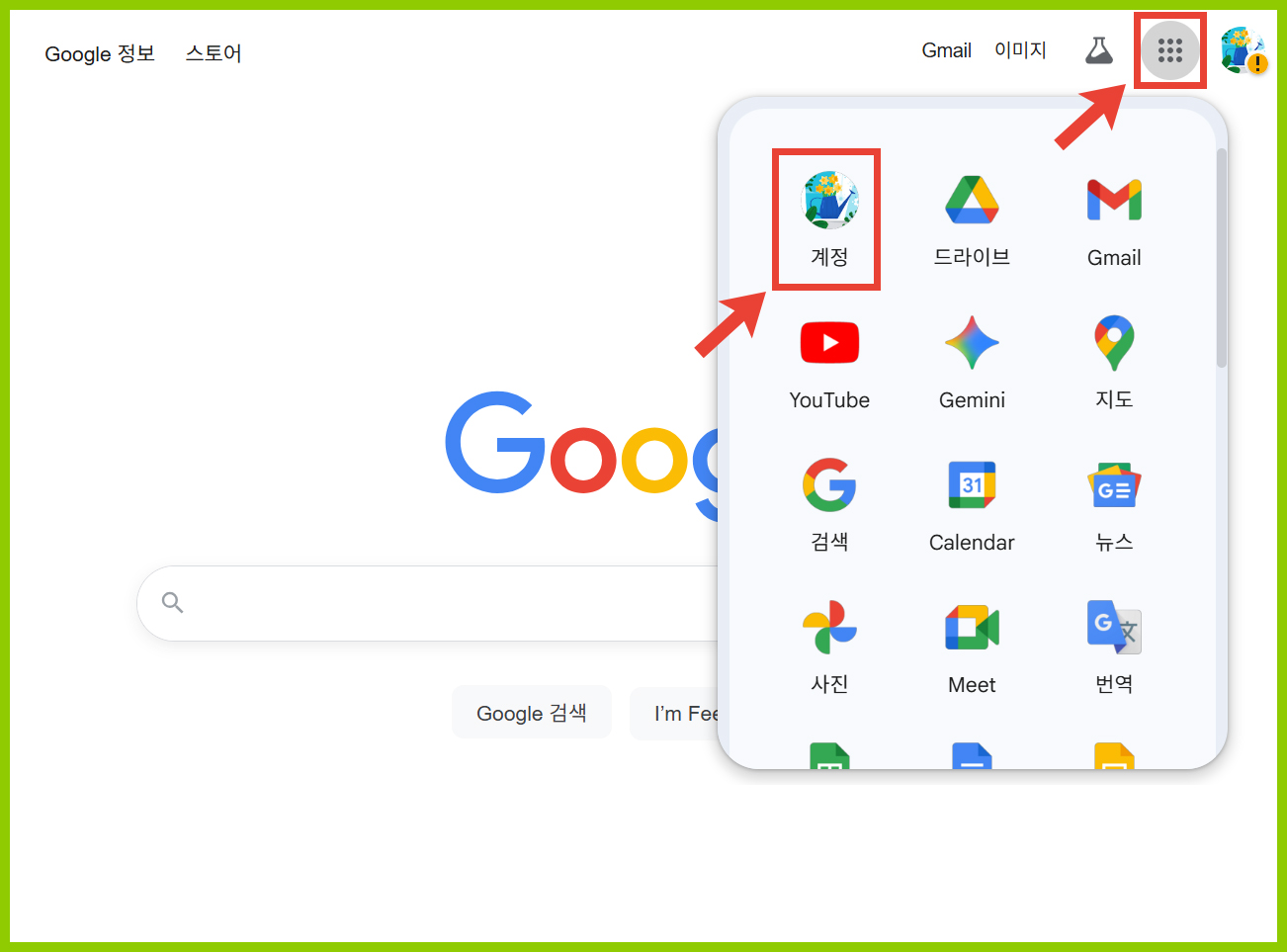 로그인후 화면 오른쪽 상단 점6개를 클릭하면 구글의 다양한 서비스들이 보입니다.