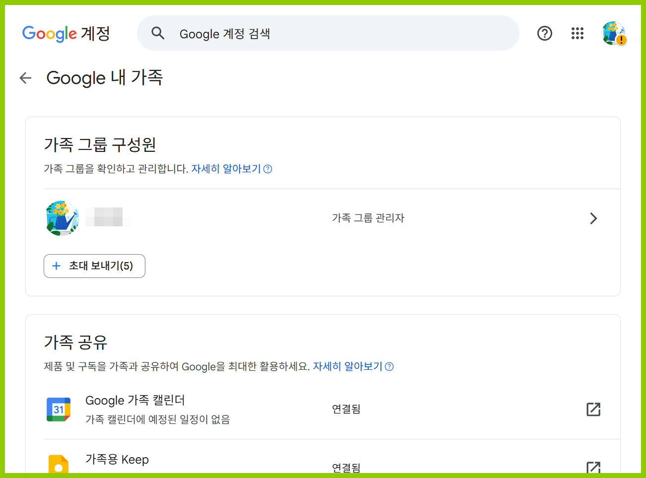 가족 그룹을 만드는 사람이 가족 그룹 관리자가 됩니다. 관리자는 가족 그룹 구성원 및 공유하는 서비스를 관리할 수 있습니다. 가족 구성원은 가족 그룹 관리자의 이름, 이메일 주소, 프로필 사진을 볼 수 있습니다.